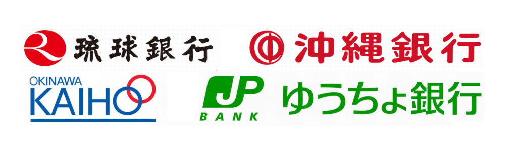 琉球銀行・沖縄銀行・沖縄海邦銀行・ゆうちょ銀行はもちろん、三菱UFJ銀行・三井住友銀行・みずほ銀行の都市銀行にも対応しております。さらにPayPay銀行・楽天銀行などのネットバンクにも対応しております。※その他の銀行をご希望の場合はご確認ください。
